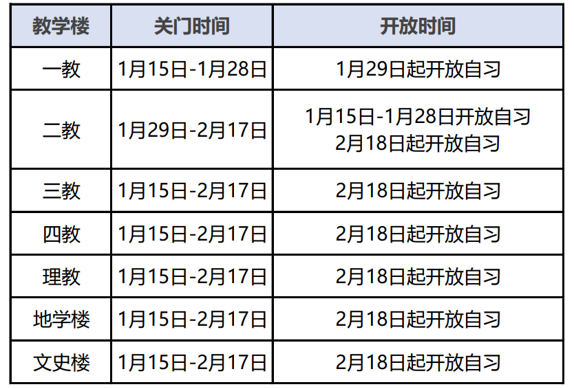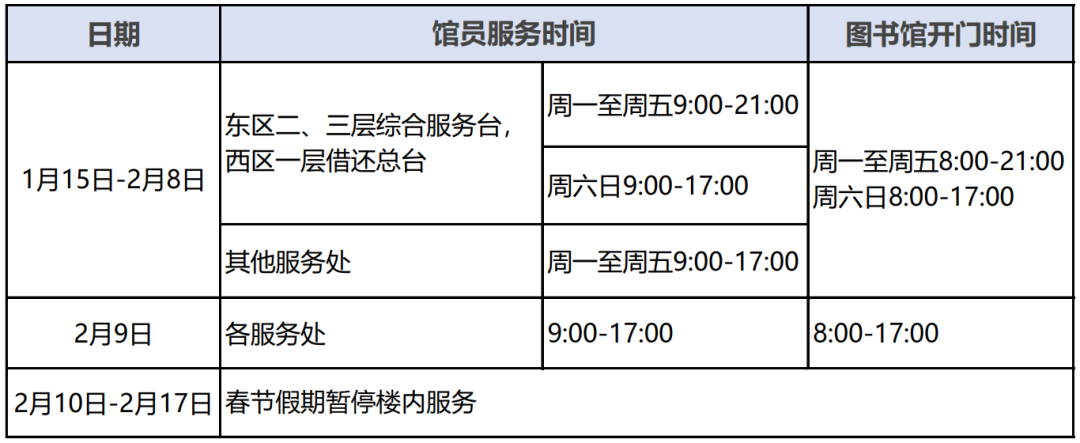 1 1月15日-2月9日,图书馆只开东门和南门。