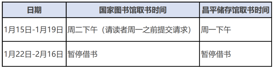 5 馆际互借服务和昌平储存馆取书服务时间有所调整:BALIS借书、BALIS文献传递1月22日-2月16日暂停,国家图书馆、昌平储存馆取书时间如下: