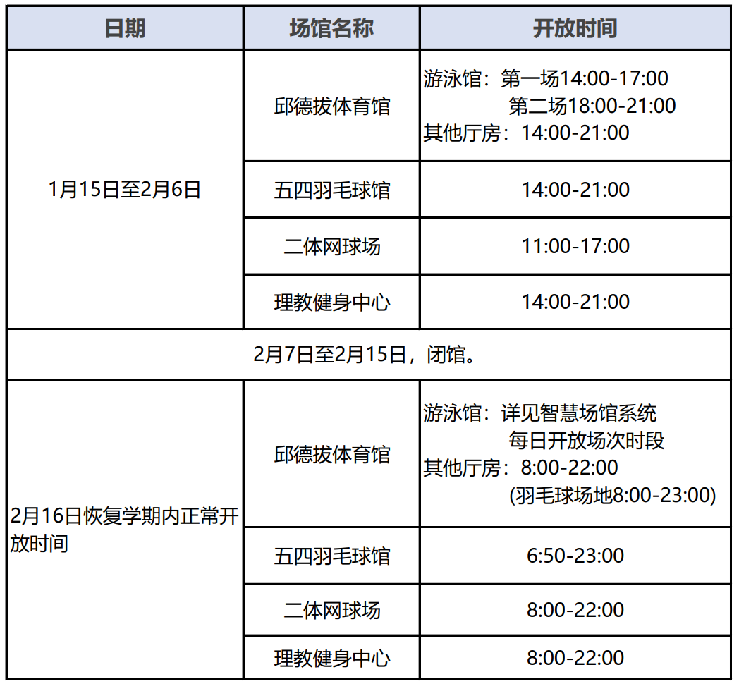 为保障在校师生的体育锻炼需求,寒假期间体育场馆照常运行,具体开放时间调整如下: