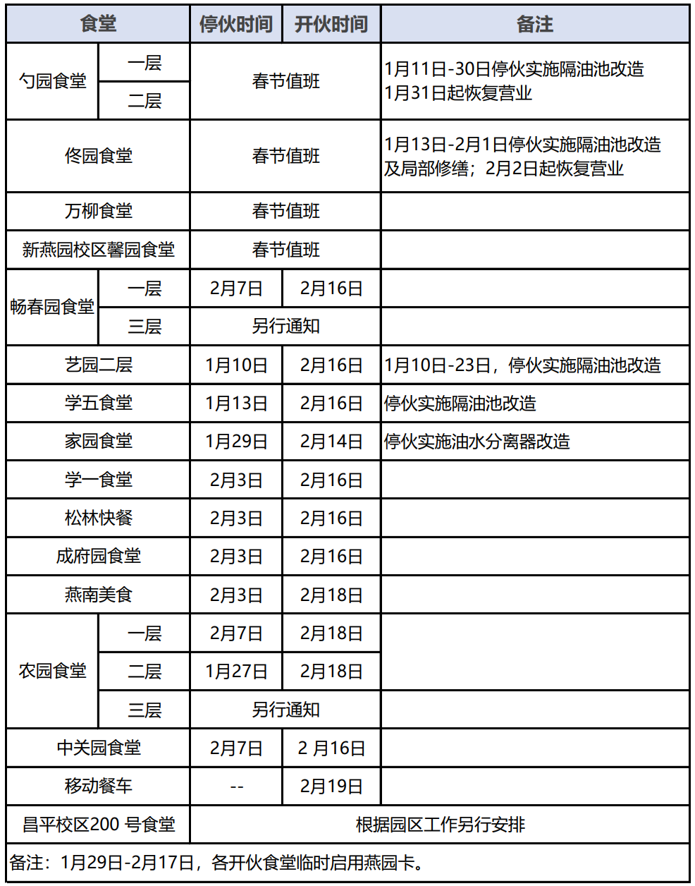 3 校园服务中心车辆管理科班车(新燕园校区)不停运(1月15日-2月18日按周末及节假日时刻表)。