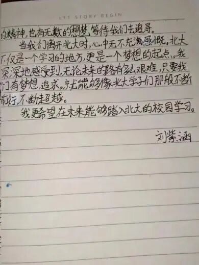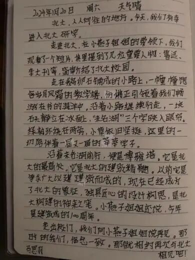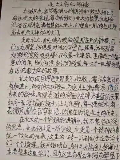 未名博雅,家国天下。共赏景,同追梦。充实的课表、日夜不息的实验、宿舍楼永远亮着的灯光,见证了北大学长学姐的踏实努力。此次研学让我下定决心,立志考上北京大学,努力学习科学文化知识,为国家的建设添砖加瓦。以青春之我,赴时代之约。