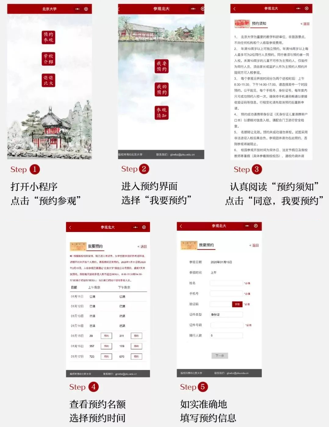 每日可预约时段为:09:00-11:00、14:00-16:00。预约成功后,请携带身份证(无身份证儿童请携带户口本等有效证件)由东侧门(地铁四号线北京大学东门站A口向北)校园参观专用通道刷脸入校,并于当日19:00前离校。