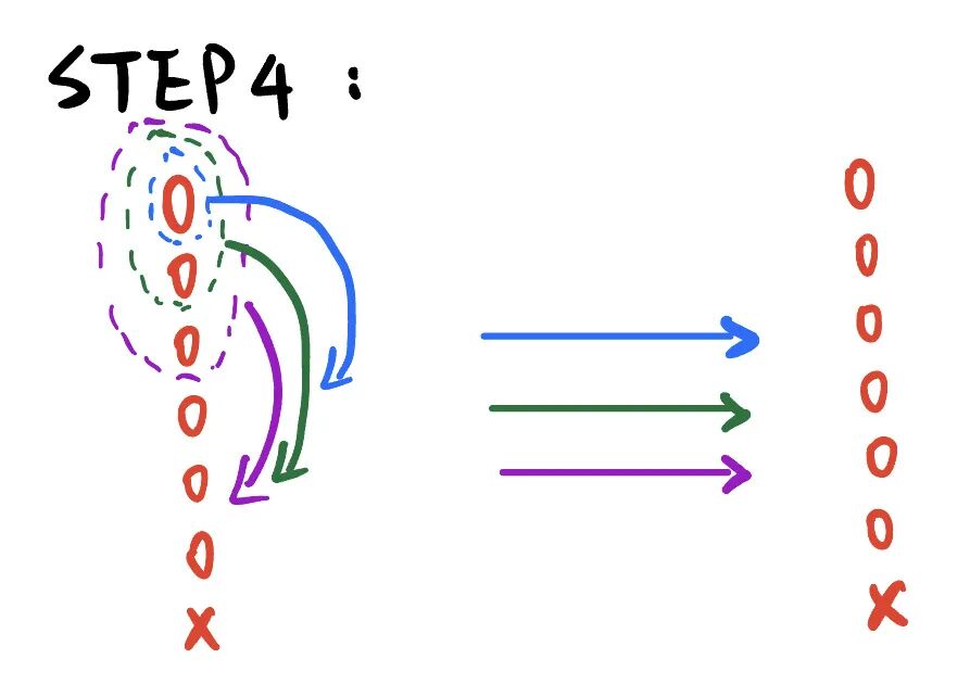 从这一步开始,我们只考虑当前牌堆中排在第四及第八的两张牌,记为X,其他牌记为0。那么根据上一步的讨论,可以得到当前的牌堆形如: