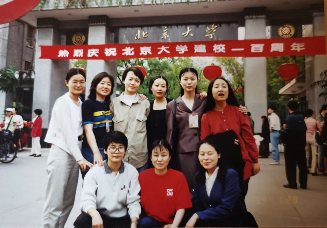 △1998年北京大学百年校庆时,贺桂梅与同学们在校门口合影(后排左一为贺桂梅)