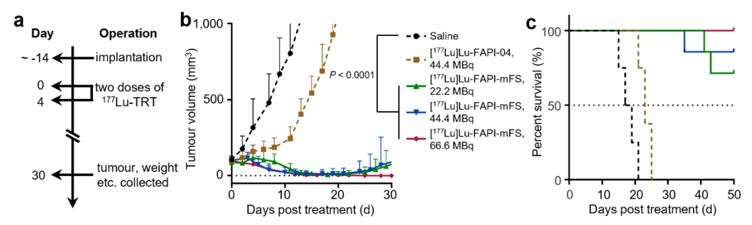 图3 [177Lu]Lu-CTR-FAPI可几乎完全抑制肿瘤生长,并延长小鼠生存期。a, 治疗方案;b, 肿瘤生长曲线;c, 生存曲线。