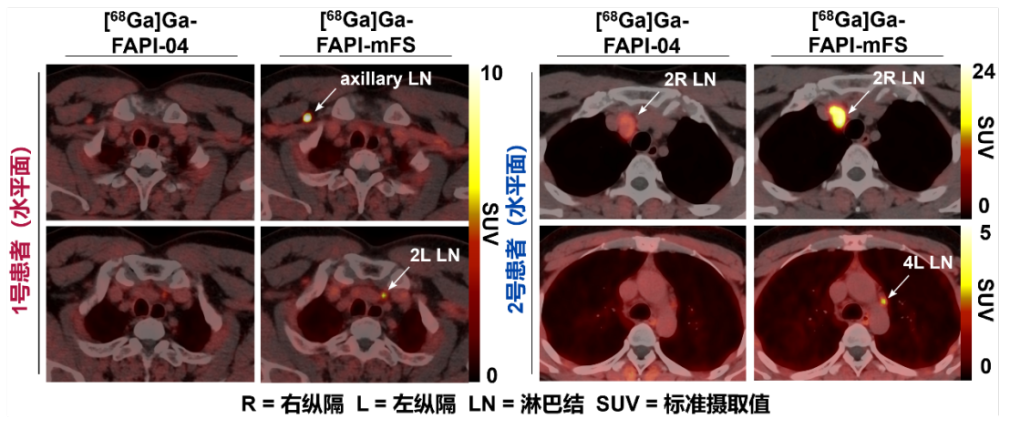 基于一系列分子实验和细胞验证,研究人员分别在FAP高表达的细胞来源移植小鼠模型(Cell-derived xenograft, CDX)和患者来源移植小鼠模型(Patient-derived xenograft, PDX)中进一步验证,发现PET诊断核素Ga-68标记的CTR-FAPI(如[68Ga]Ga-FAPI-mFS)显示出比原始FAPI-04高2倍以上的肿瘤摄取,而健康组织中的摄取迅速降低。在一项初步的肿瘤成像临床研究中,这一策略比其他方法(包括传统FAPI-PET/CT)识别出了更多的甲状腺髓样癌病灶,并通过手术和病理研究确认了这些病灶为真阳性(图2)。以上结果说明CTR-FAPI有潜力成为下一代更高灵敏度的FAPI-PET探针。
