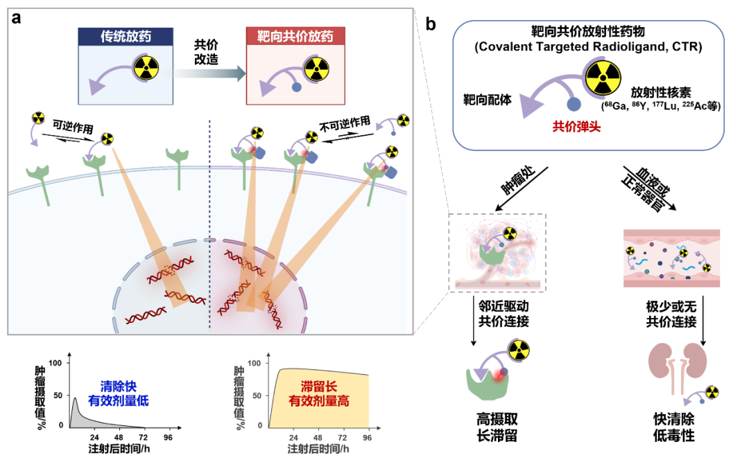 靶向共价放射性药物(Covalent Targeted Radioligand,CTR),是一种高度选择性地将放射性配体固定到肿瘤的新型药物形式。该技术增强了放射性配体的肿瘤摄取和保留,并保证其在血液循环或健康组织的低摄取,有望攻克传统核药物安全性与有效性无法兼得的难题(图1a)。