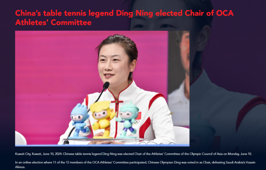 2024年6月10日,亚洲奥林匹克理事会官方宣布,前中国女子乒乓球运动员、大满贯得主丁宁当选为亚奥理事会运动员委员会主席。