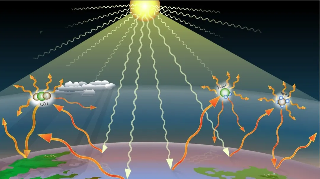 地球大气层中的温室气体(如二氧化碳、甲烷)类似温室的玻璃、能够吸收红外辐射,从而减缓地球表面的热量散失。
