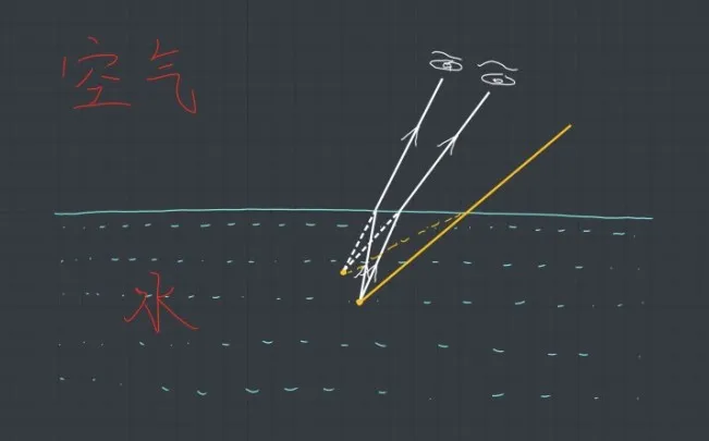 “费马原理”告诉我们,光线是要沿着最短时间的路径去传播,所以光在空气中传播最短的时间就是一条直线。但光在不同介质中传播的速度不一样,在水中传播速度比在空气中传播的更慢一些,光从水中传到空气中,为了达到最短时间,需要在水里少走一段,在空气中多走一段,于是就要走一个折线,这就是光的折射现象。
