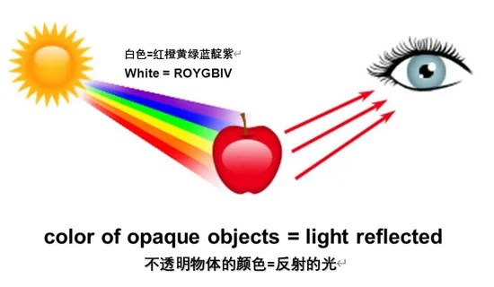 太阳光是理解颜色的关键。物体吸收某些颜色的光线,反射其它的,我们看到的就是反射光的颜色。例如,红苹果反射红光,因此看起来是红色。