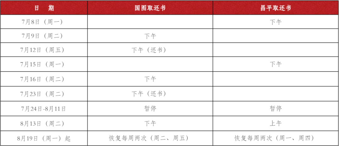 5 馆际互借服务时间有所调整:BALIS借书、BALIS文献传递7月22日-8月25日暂停。国家图书馆和昌平取还书安排如下: