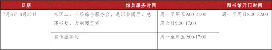 根据学校《关于做好暑假期间工作的通知》,暑假期间图书馆在线资源和相关服务平台正常运行、全面保障,楼内服务安排如下: