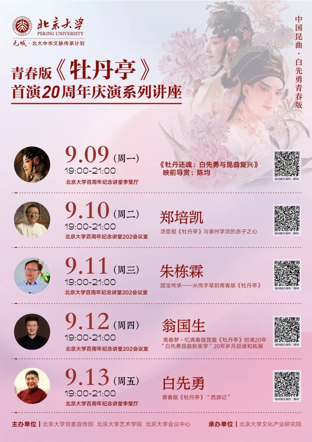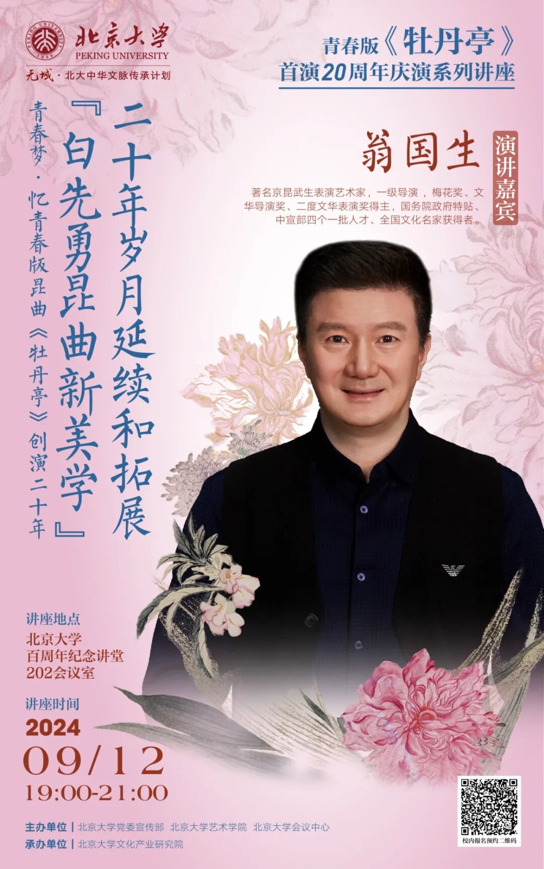 为深化理解昆曲艺术,积极搭建古老昆曲与年轻学子的心灵桥梁,2024年9月9日至13日,北京大学党委宣传部、艺术学院、会议中心主办,北京大学文化产业研究院承办的“青春版《牡丹亭》首演20周年庆演系列讲座”,将邀请5位知名学者与艺术家,共飨一场美轮美奂的文化艺术盛宴。