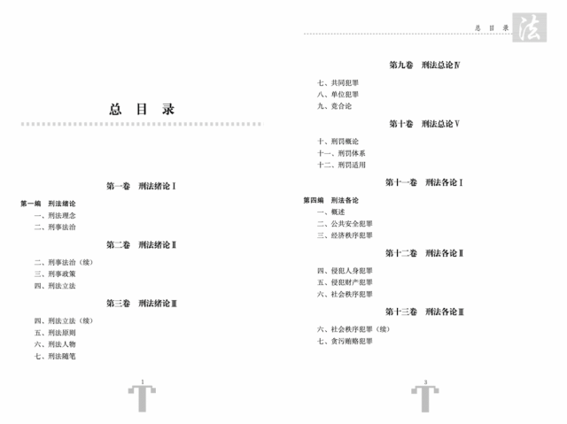 鉴于本文集巨大的学术价值和独特的学术意义,它在体例上另辟蹊径:与过往阶段性论文集不同,不再以时间为主要编排序,而是颇有巧思地按照刑法学体系分为刑法绪论、刑法理论、刑法总论、刑法各论四大部分,各部分内再分专题依时序呈现。