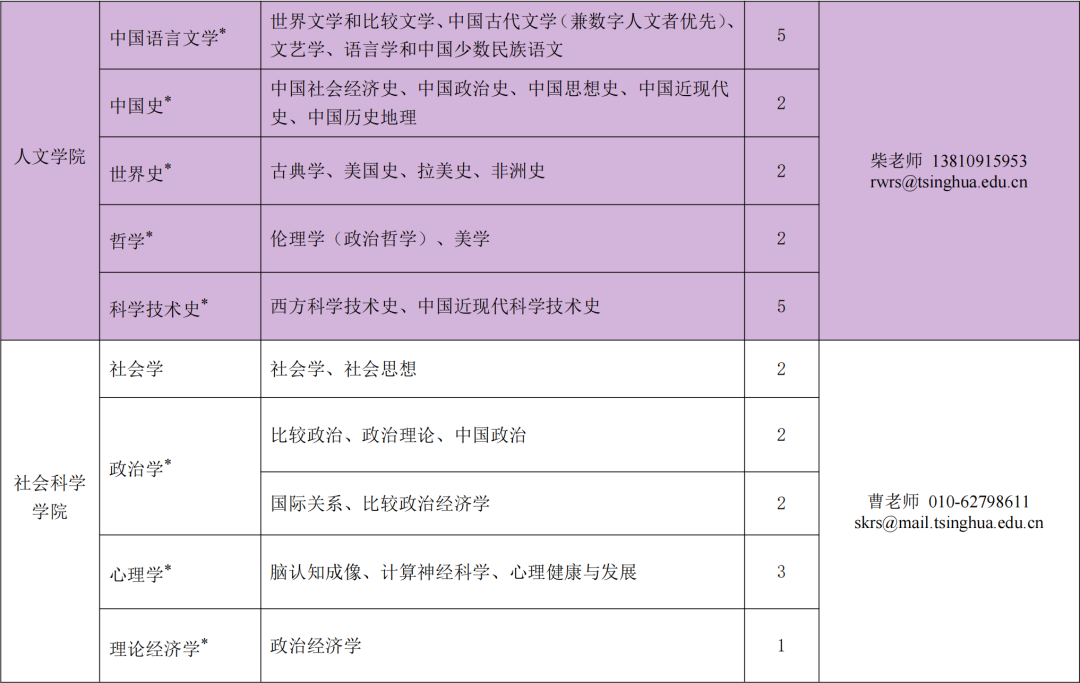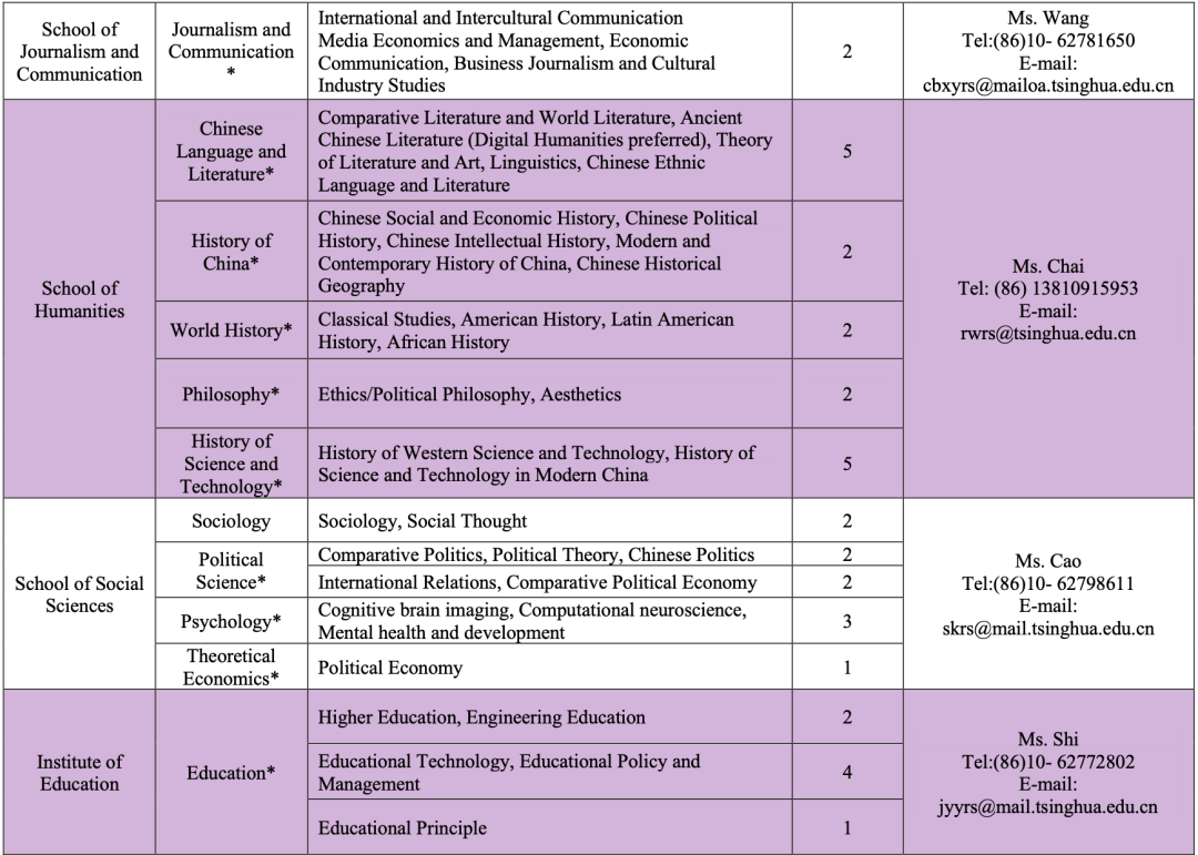 注:本招聘以顶尖学者和杰出学者为主,岗位为教授和长聘副教授;部分学科(以*标注)可受理准聘副教授、助理教授岗位申请。
