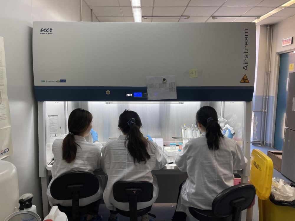 张林琦教授团队博士生魏婧、李明茜、雷雨晴(从左至右)在检测小鼠血清中的中和抗体含量并评估疫苗的免疫效果