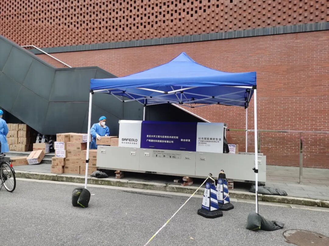 4月22日,接到任务仅仅一周后,姚其副教授的紫外线消杀团队,已将研发的三种紫外光消杀设备运抵复旦校园,正式亮相、“上岗”。