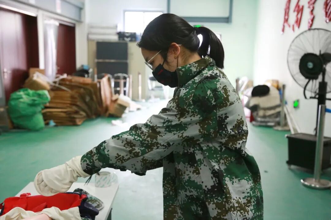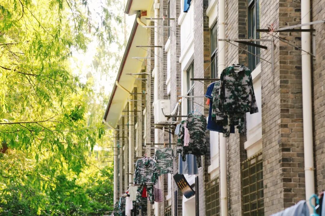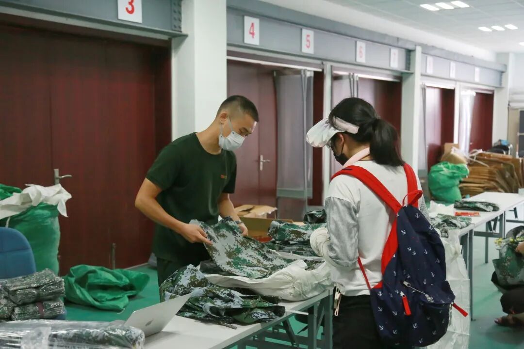 出门看队列,进门看内务。军训首日,第一项任务就是学生入队、整理内务。同学们正在按照教官的指导要求整理房间内的卫生,衣物、被子、洗漱用品的摆放。