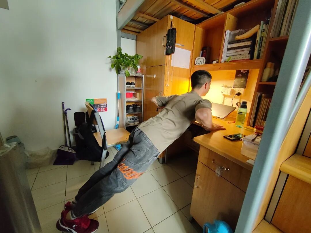 陈禹潜还在寝室铺了一个瑜伽垫,每天都跟着一些健身APP做有氧运动和自重运动,譬如HIIT之类的运动。活络筋骨之后,他更加神清气爽,元气满满地在寝室里度过每一个朝夕旦暮。
