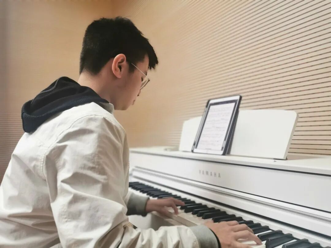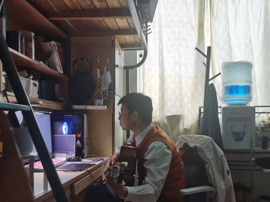 当《肖邦第一叙事曲》的旋律响起,便是2020级生命科学学院本科生卢绍荣指尖绽放的琴音。封闭的寝室楼里没有钢琴,卢绍荣便在寝室里练习吉他和绘画的新爱好。他也是Echo合唱团成员,经常练习歌唱,传达心声。