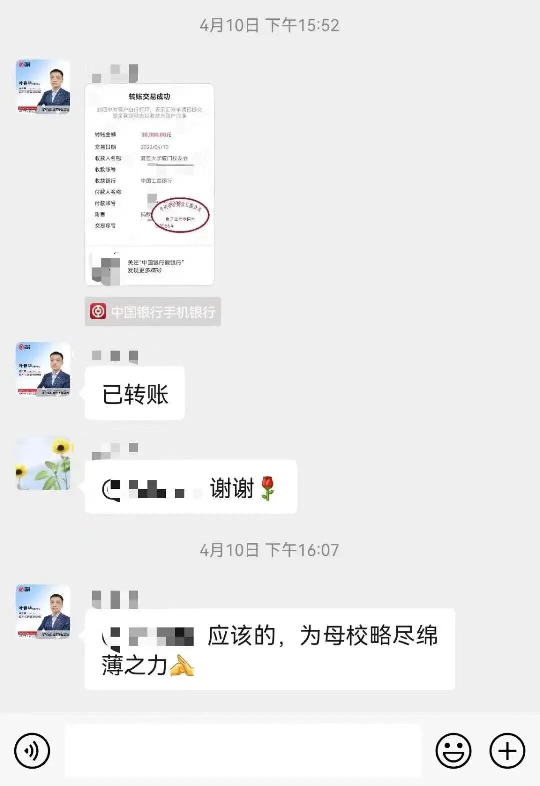 在母校疫情防控最吃劲的阶段,厦门校友会心系母校,自发组织校友募集捐赠资金,1天半时间内71位校友爱心接力,筹集资金20.55万元,用于师生防疫生活物资采购,与母校共克时艰。