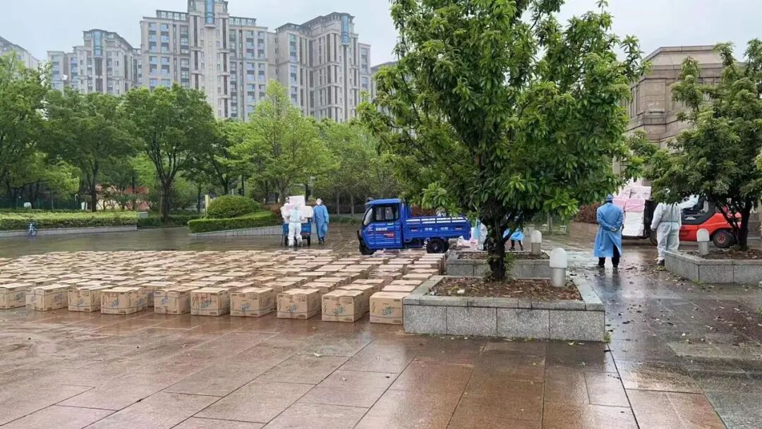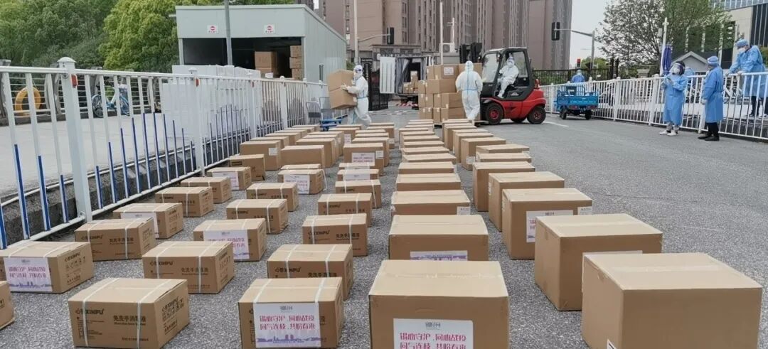 无锡市经济开发区紧急组织筹集的一批包括隔离衣、免洗消毒液、医用外科口罩和抗原试剂在内的抗疫物资驰援上海。下午,3辆货车满载着无锡人民的关切与牵挂抵达复旦大学。