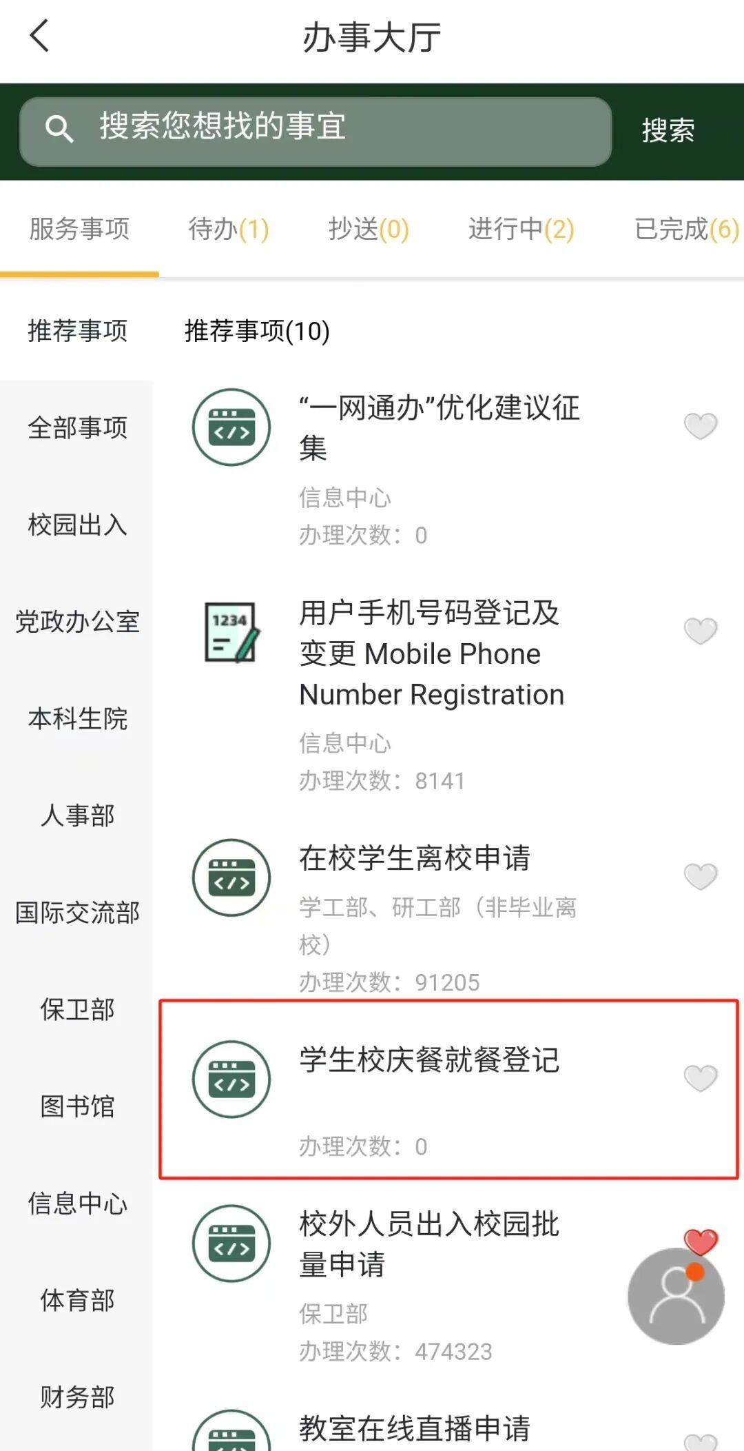 3. 第三步:进入“办事大厅”应用,在首页点击“学生校庆餐就餐登记”。