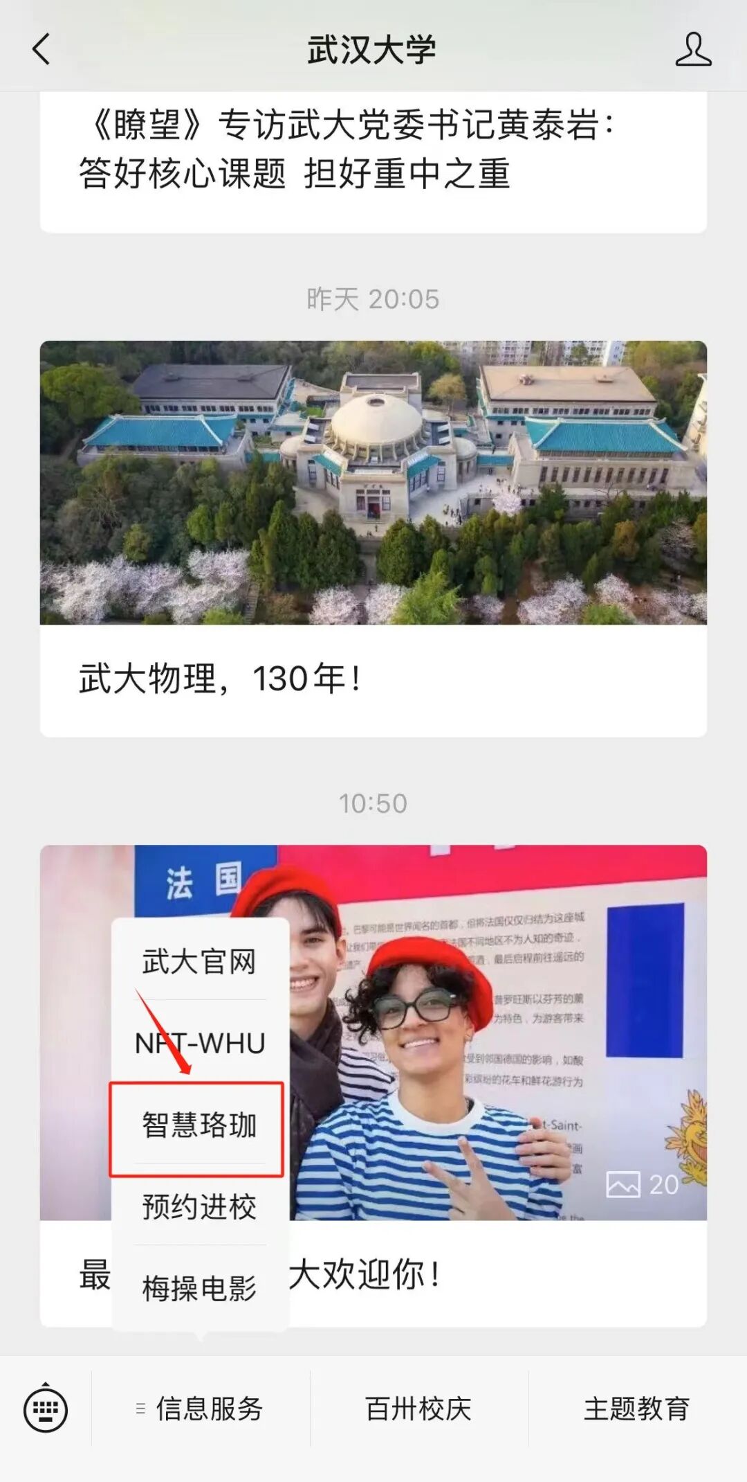 2. 第二步:点击信息服务,选择“智慧珞珈”。