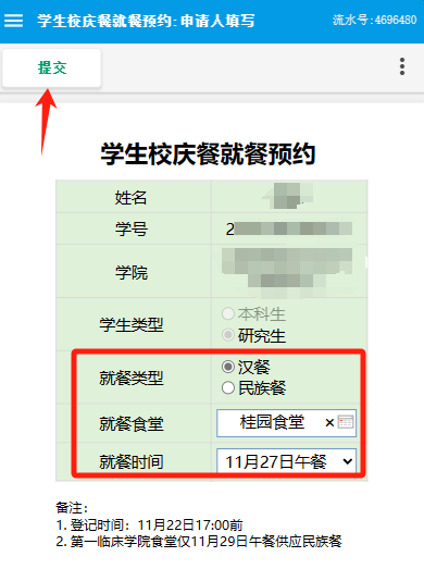 4. 第四步:选择就餐类型(汉餐或民族餐)、就餐食堂、就餐时间(11月27日-29日午餐或晚餐),点击左上角提交后即可。