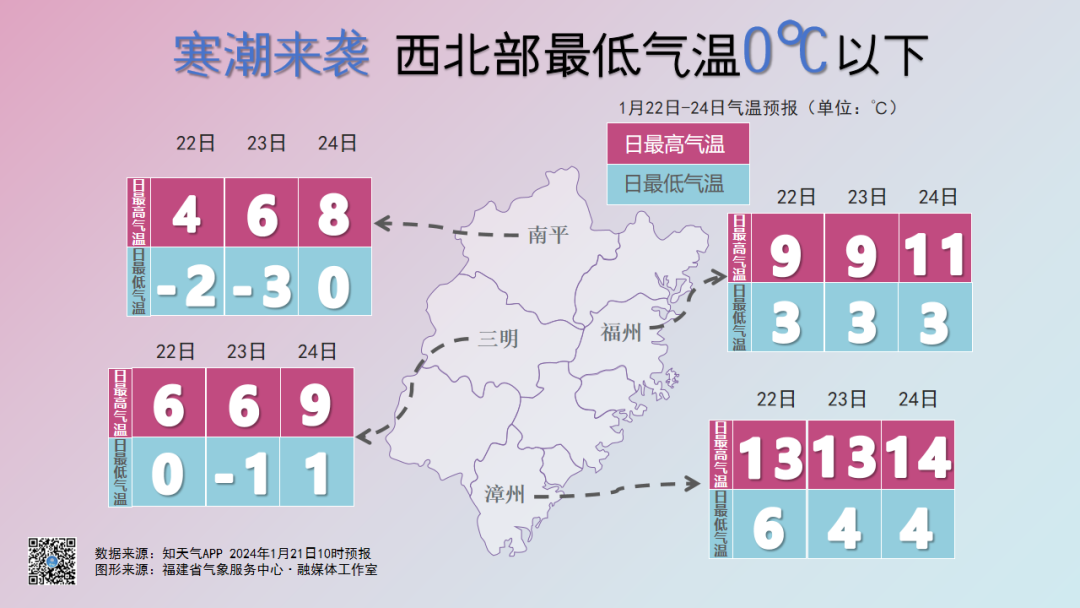 受强冷空气影响,我省气温持续下降,最低气温过程降温幅度全省大部可达8℃—15℃(局部超过16℃),中北部地区将出现寒潮天气。今天—25日全省气温较低,最低气温出现在24日前后,南平、三明、宁德三市大部和龙岩北部的城区可达-3℃—0℃(局部可达-6℃—-4℃),有结冰;福州、龙岩南部和泉州西北部的城区0℃—4℃,有霜或霜冻,局部有结冰;其余地区城区4℃—8℃。