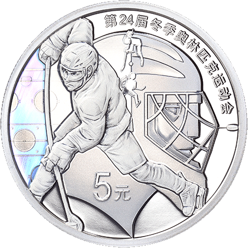 15克圆形银质纪念币背面图案为冬季奥林匹克运动会运动项目——冰球运动造型,衬以装饰风格的运动竞技场景等元素组合设计,并刊“第24届冬季奥林匹克运动会”字样及面额。