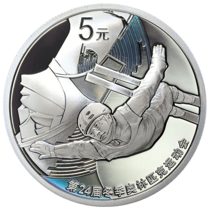 15克圆形银质纪念币背面图案为自由式滑雪运动造型等装饰组合设计,并刊“第24届冬季奥林匹克运动会”字样及面额。