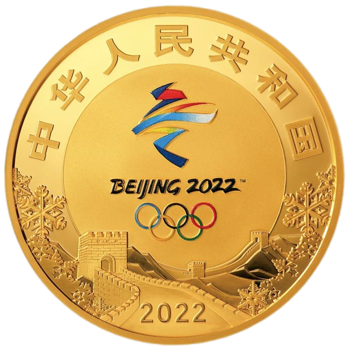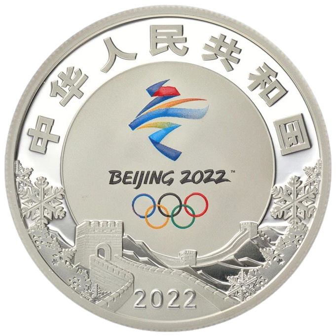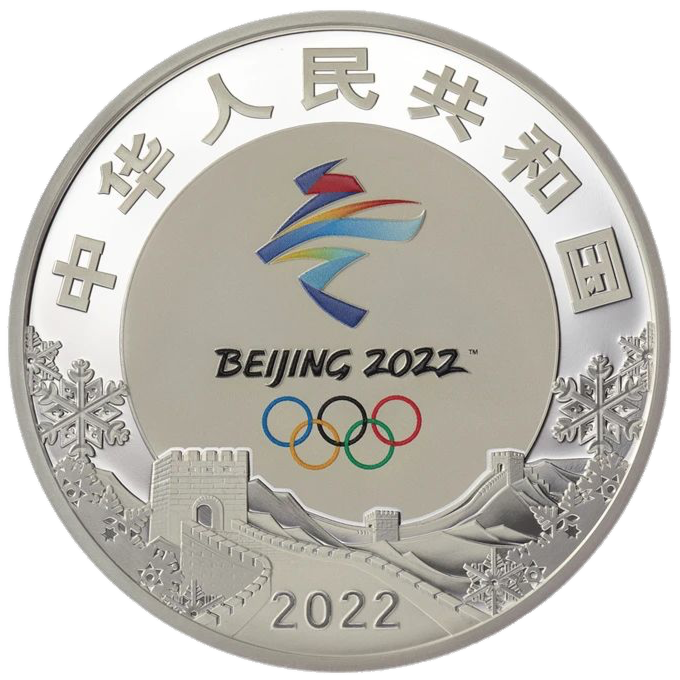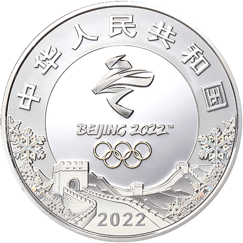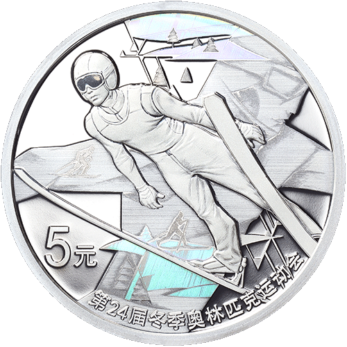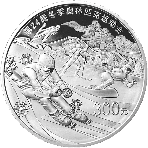 1公斤圆形银质纪念币背面图案为冬季奥林匹克运动会运动项目——高山滑雪、越野滑雪、单板滑雪、跳台滑雪等运动造型,衬以长城、国家跳台滑雪中心、首钢滑雪大跳台等元素组合设计,并刊“第24届冬季奥林匹克运动会”字样及面额。