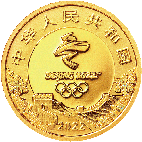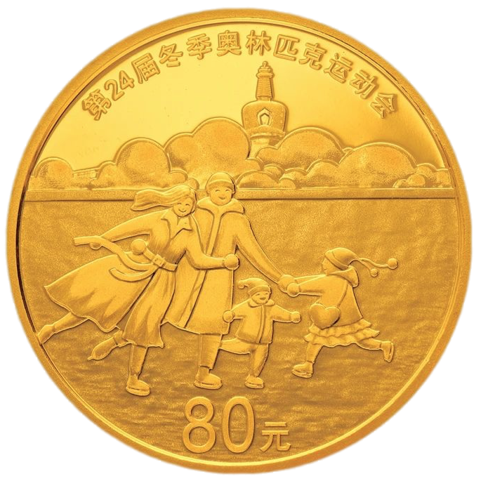 5克圆形金质纪念币背面图案为装饰风格的北京传统冬季运动滑冰造型、北京传统古建筑、冰场等元素组合设计,并刊“第24届冬季奥林匹克运动会”字样及面额。