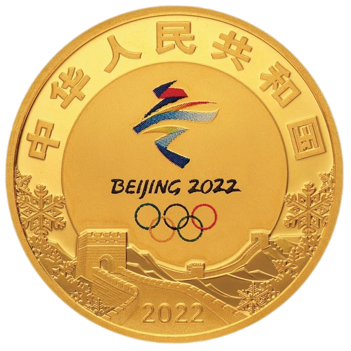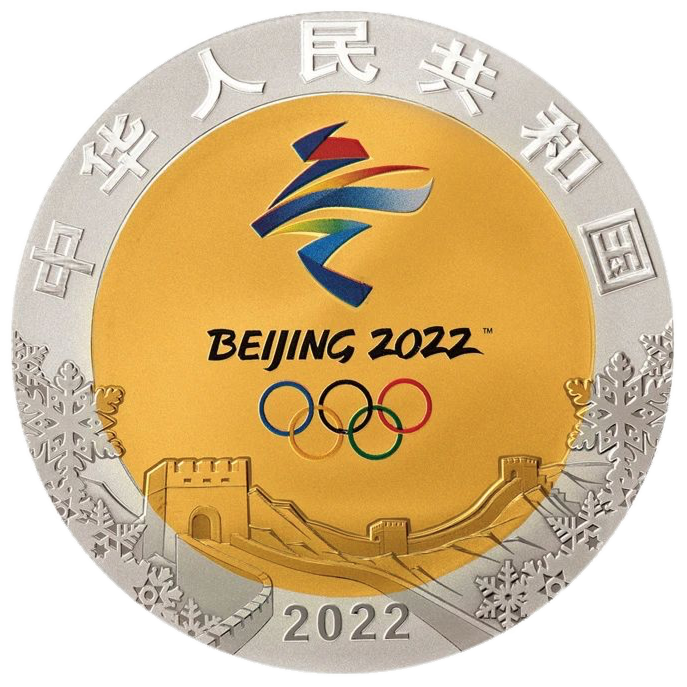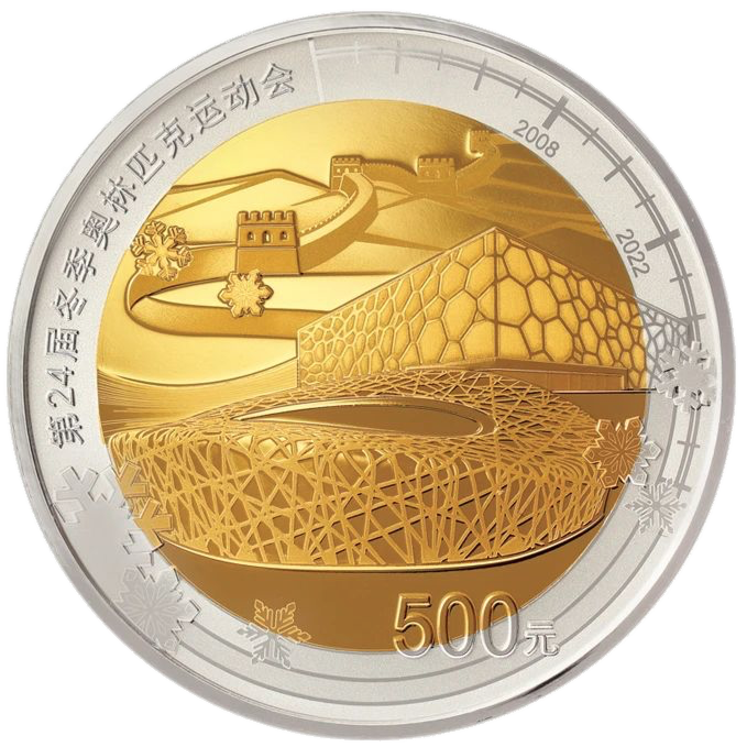 30克金12克银圆形双金属纪念币背面图案为国家体育场、国家游泳中心场馆造型,衬以长城、雪花等装饰组合设计,并刊“第24届冬季奥林匹克运动会”字样及面额。