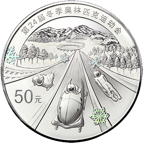 150克圆形银质纪念币背面图案为冬季奥林匹克运动会运动项目——钢架雪车、雪车、雪橇等运动造型,衬以国家雪车雪橇中心赛道、雪花等元素组合设计,并刊“第24届冬季奥林匹克运动会”字样及面额。
