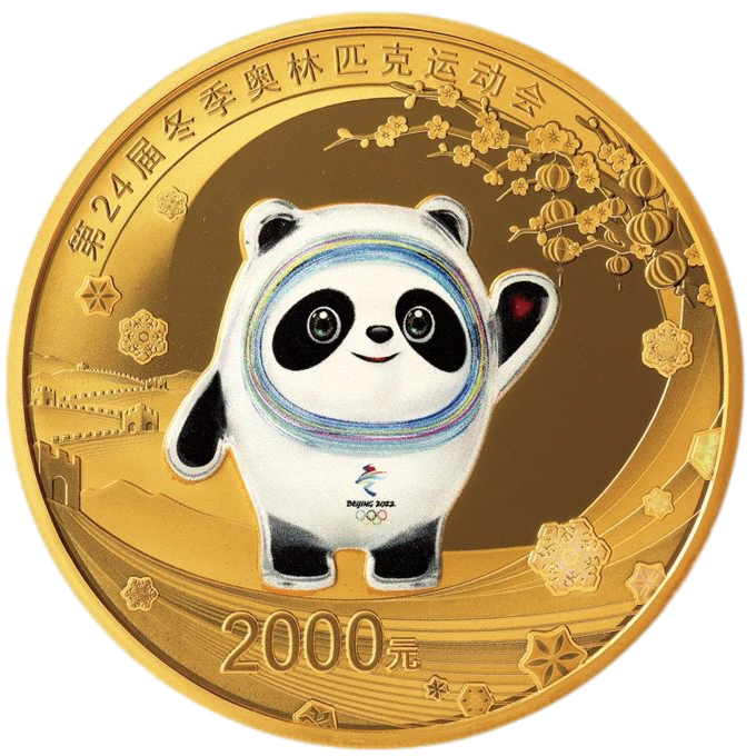 150克圆形金质纪念币背面图案为第24届冬季奥林匹克运动会吉祥物,衬以长城、梅花、灯笼、雪花等装饰组合设计,并刊“第24届冬季奥林匹克运动会”字样及面额。