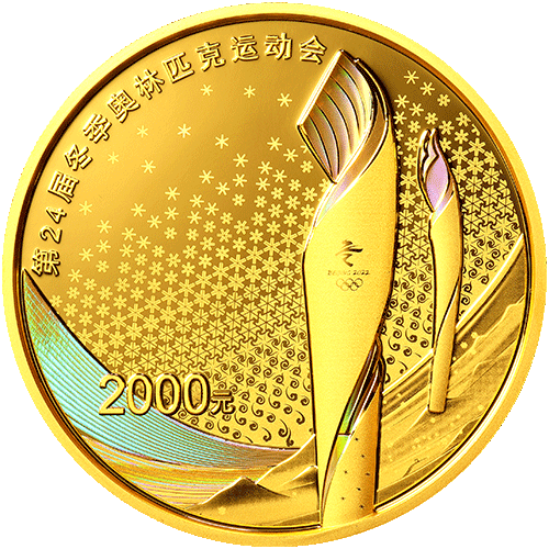 150克圆形金质纪念币背面图案为第24届冬季奥林匹克运动会火炬,衬以火炬表面的祥云雪花图案、核心图形等元素组合设计,并刊“第24届冬季奥林匹克运动会”字样及面额。