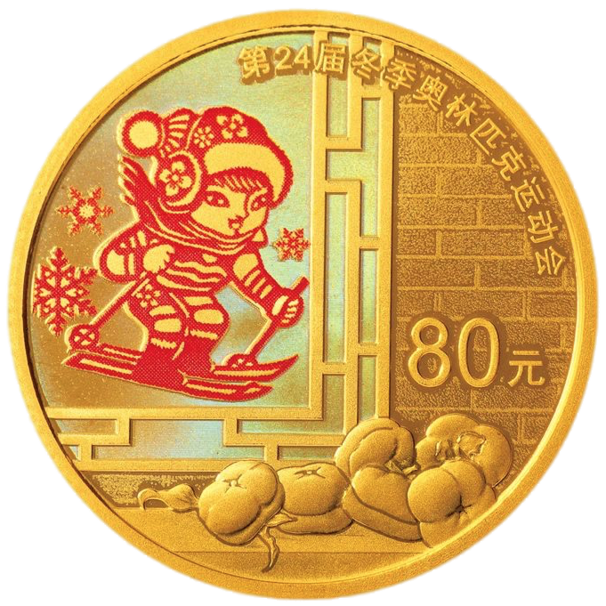 5克圆形金质纪念币背面图案为张家口蔚县剪纸风格滑雪造型,衬以柿子、窗棂等组合设计,并刊“第24届冬季奥林匹克运动会”字样及面额。