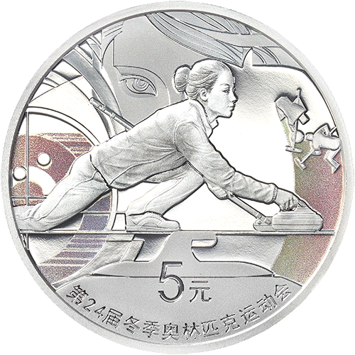 15克圆形银质纪念币背面图案为冬季奥林匹克运动会运动项目——冰壶运动造型,衬以装饰风格的运动竞技场景等元素组合设计,并刊“第24届冬季奥林匹克运动会”字样及面额。
