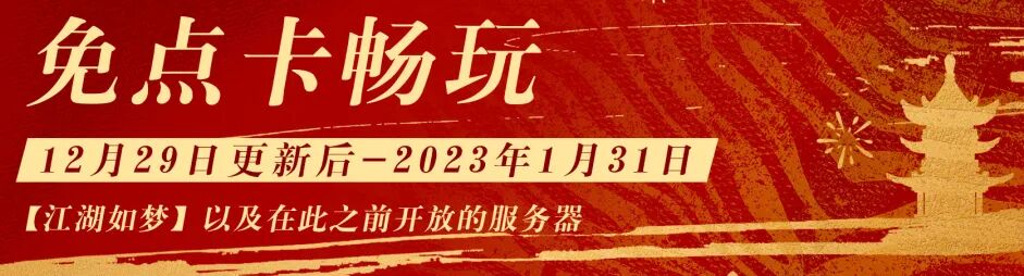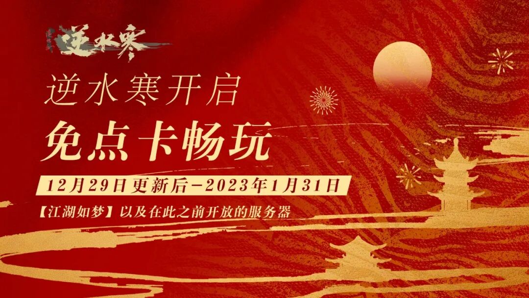 第一重——12月29日更新后,逆水寒即刻开启免点卡活动,江湖如梦及在此之前开放的服务器,均可免费畅玩34天!