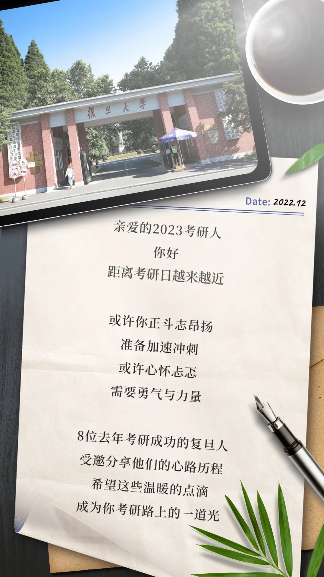 去年考研,是我第一次进复旦。当时去的是江湾校区,一进门就看到一个横幅“欢迎报考复旦大学,祝考试顺利”,我就在脑海中遐想,哇,明年我也会来这里吗?幸运的是,我真的来了。我想对今年的考研学子说:先放心大胆地走完这一程吧,不要犹豫。