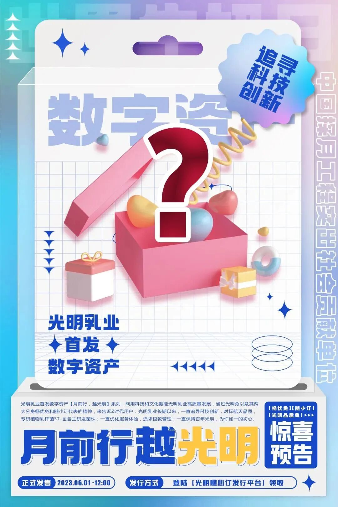 月前行越光明,光明乳业以心意和新意不断助力中国探月之旅。光明乳业联合上海数据交易所,发布首个数字资产【月前行,越光明】,成为国内首家自建数字资产发行平台的乳企!6月1日12:00,【光明随心订APP】作为发行平台完成首发,限量发行1010份,盛邀大家于“61世界牛奶日”抢限量款光明数字资产!