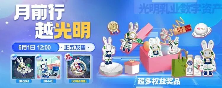 光明乳业作为国内首家自建数字资产发行平台的乳企,本次将推出“畅优兔”、“随小订”、“光明品质兔”3款数字资产形象,每一款都携带多重惊喜权益: