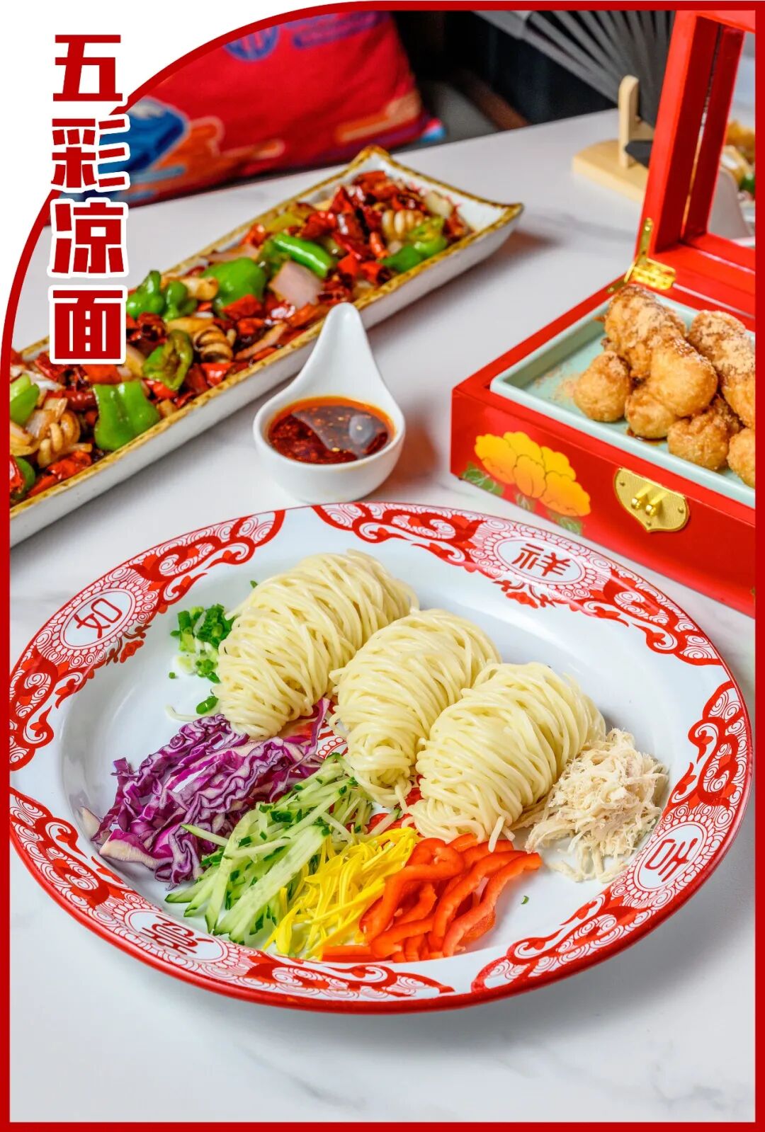 鸡丝、紫甘蓝、黄瓜、菊花、红辣椒,五种配料五种色彩,光靠摆盘就征服了腿妹的心。