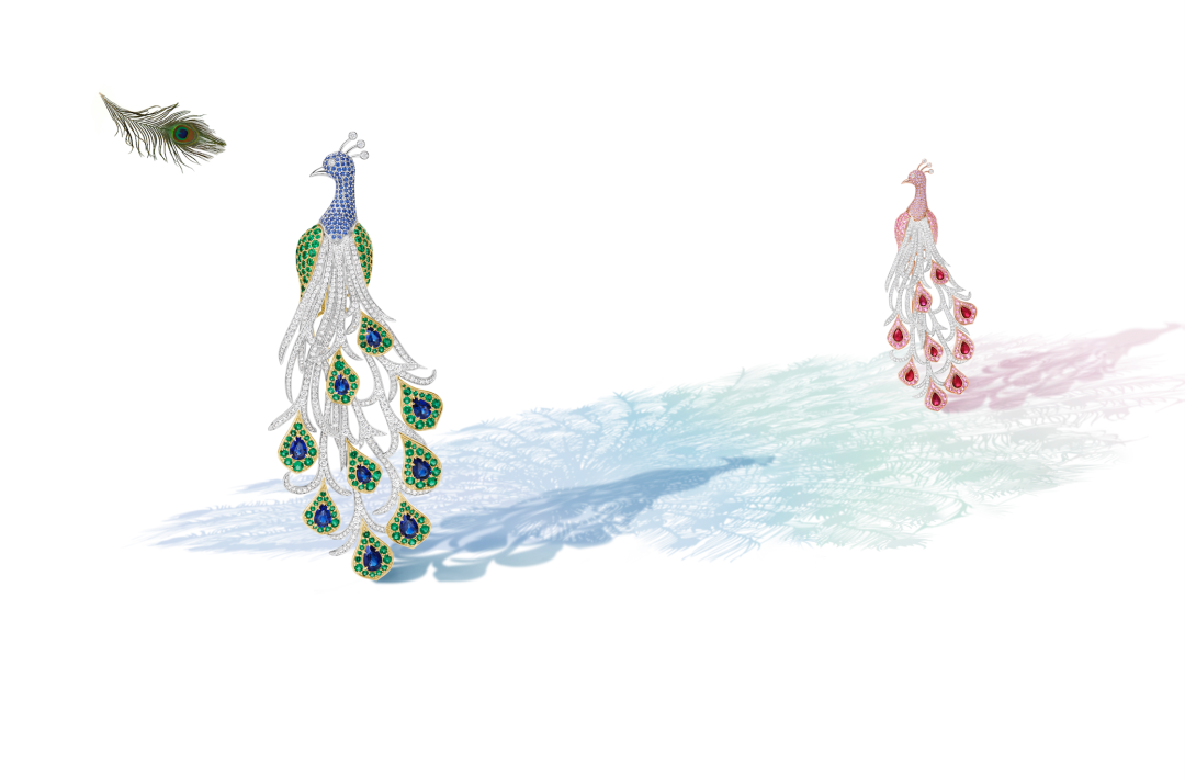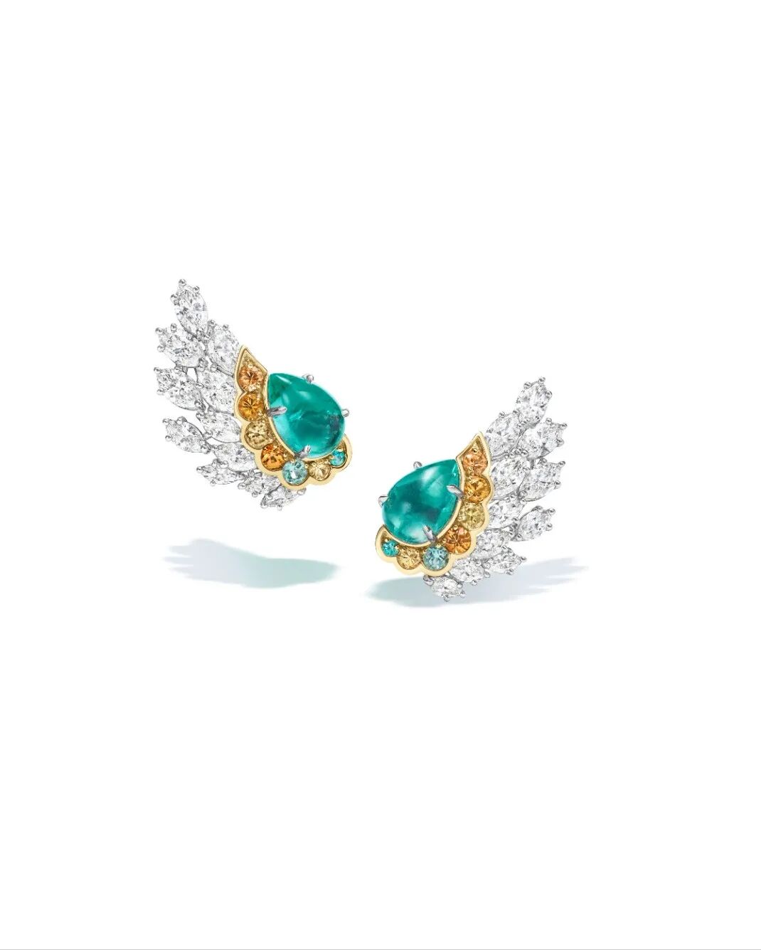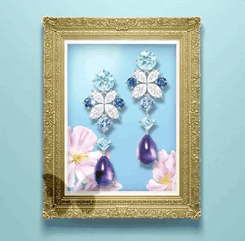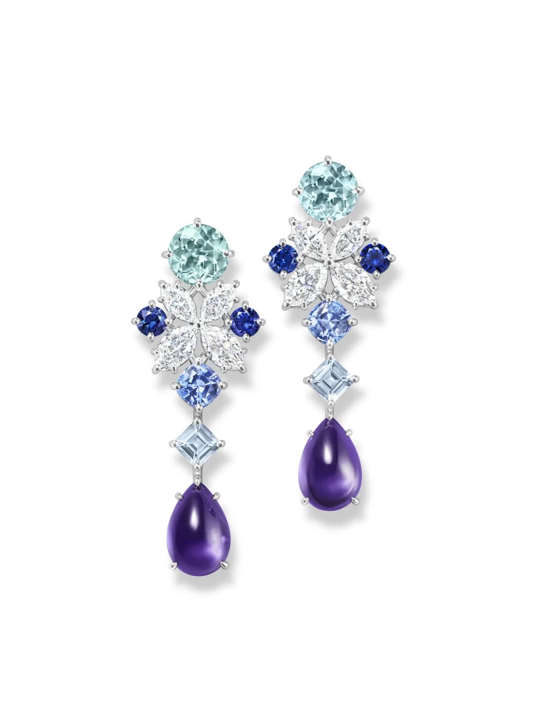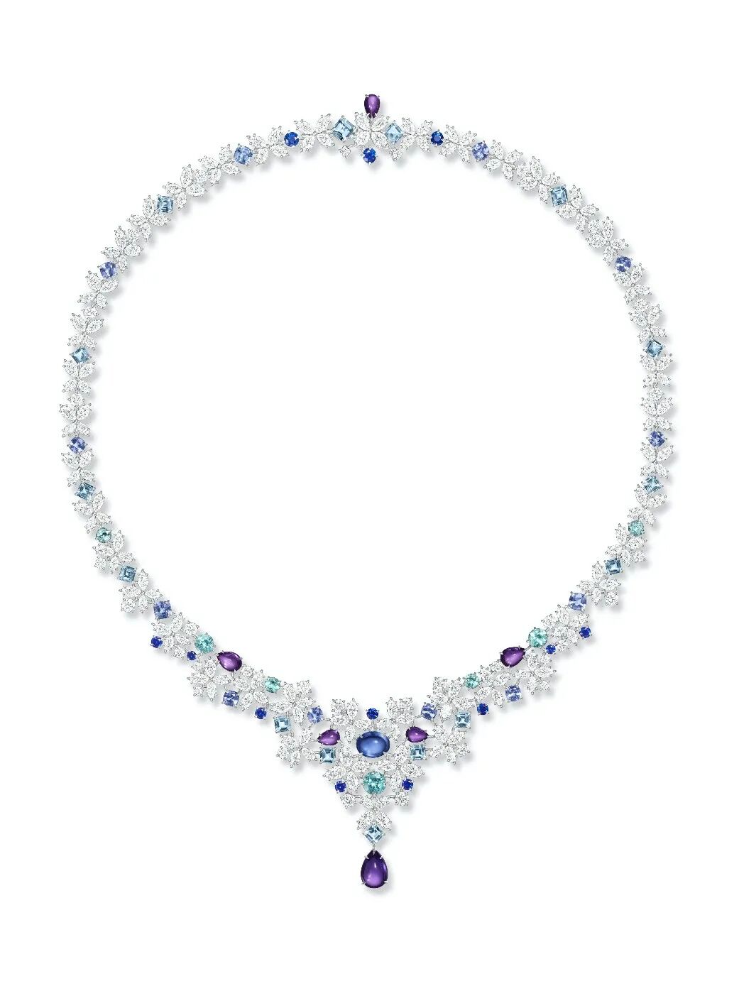 海瑞温斯顿Marvelous Creations高级珠宝系列而Peacock胸针便以祖母绿、蓝宝石和钻石的组合,及粉钻、红宝石、粉色蓝宝石和钻石的组合,分别映衬出孔雀的不同优雅。海瑞温斯顿Marvelous Creations高级珠宝系列珍贵的帕拉伊巴碧玺、紫色和蓝色蓝宝石、海蓝宝石以及钻石,呈现于Purple Marquesa项链、手链和耳环之上,随着身体摆动,珍稀宝石绽放出不同的光泽,就连蝴蝶都对它迷恋不已。