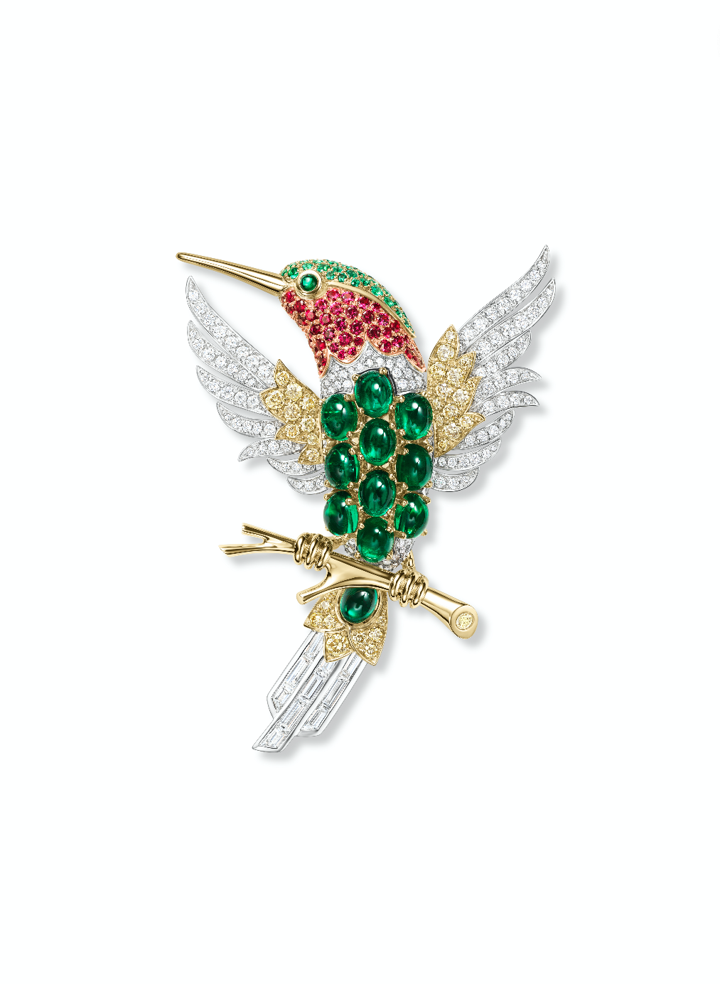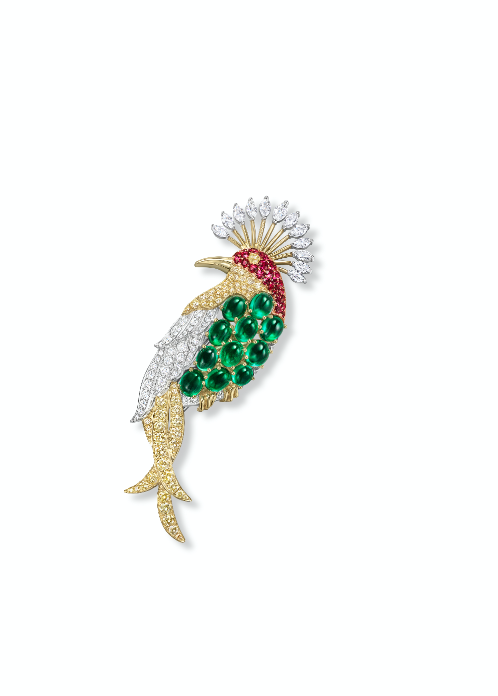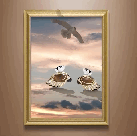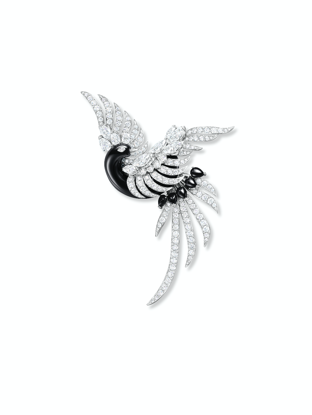 Ruddy Duck耳环和戒指,身体的部分镶嵌上水滴形帕拉伊巴碧玺并以密钉镶嵌黄色蓝宝石和锰铝榴石,而双翼则以锦簇镶嵌工艺,点缀榄尖形切工钻石。海瑞温斯顿设计师运用臻美宝石与品牌经典工艺,将其变得栩栩如生。海瑞温斯顿Marvelous Creations高级珠宝系列代表着自由的天空之城,自然界中的鸟儿在这里展翅翱翔,而装点上宝石的它们也是海瑞温斯顿Marvelous Creations系列的重要组成部分。四只不同的鸟儿演化成四枚别样的胸针,钻石、祖母绿、红宝石和黄钻等珍稀宝石被一一镶嵌其中。黑颈鹤飞行时的姿态,被设计师捕捉到Black Necked Crane胸针之上,手工雕刻的缟玛瑙和锦簇镶嵌的钻石,篆刻出它丰沛的羽翼,让它能够肆意翱翔。海瑞温斯顿Marvelous Creations高级珠宝系列而Blue Magpie胸针,则饰有手工雕刻黑色缟玛瑙和一颗作为中央宝石的碧玺,枝头小憩仍旧保持着优雅。