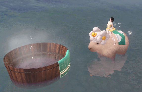 而且水豚“卡皮巴拉”祥瑞坐骑还拥有专属交互技能,可以召唤出浴桶,与同门一起沐浴放松,暂时忘却江湖纷扰。