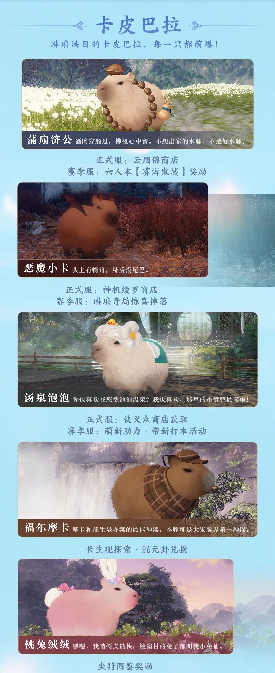 带着花花、帽子、蝴蝶结、潜水镜等等各种饰品的水豚“卡皮巴拉”主题祥瑞坐骑,精准俘获同门的心,让您沉醉于它们的可爱之中!